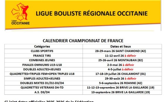 Résultats du 27 septembre à Longages Journée 1 – 27 septembre 2025 LONGAGES 31 Journée 2 – 12 Octobre 2025 Graulhet 81 Journée 3 – 13 Décembre 2025 Toulouse 31 Journée 4 – 13 Février 2026 Montauban 82 Journée 5 – 7 Mars 2026 Albi 81 Journée 6 – 5 […]